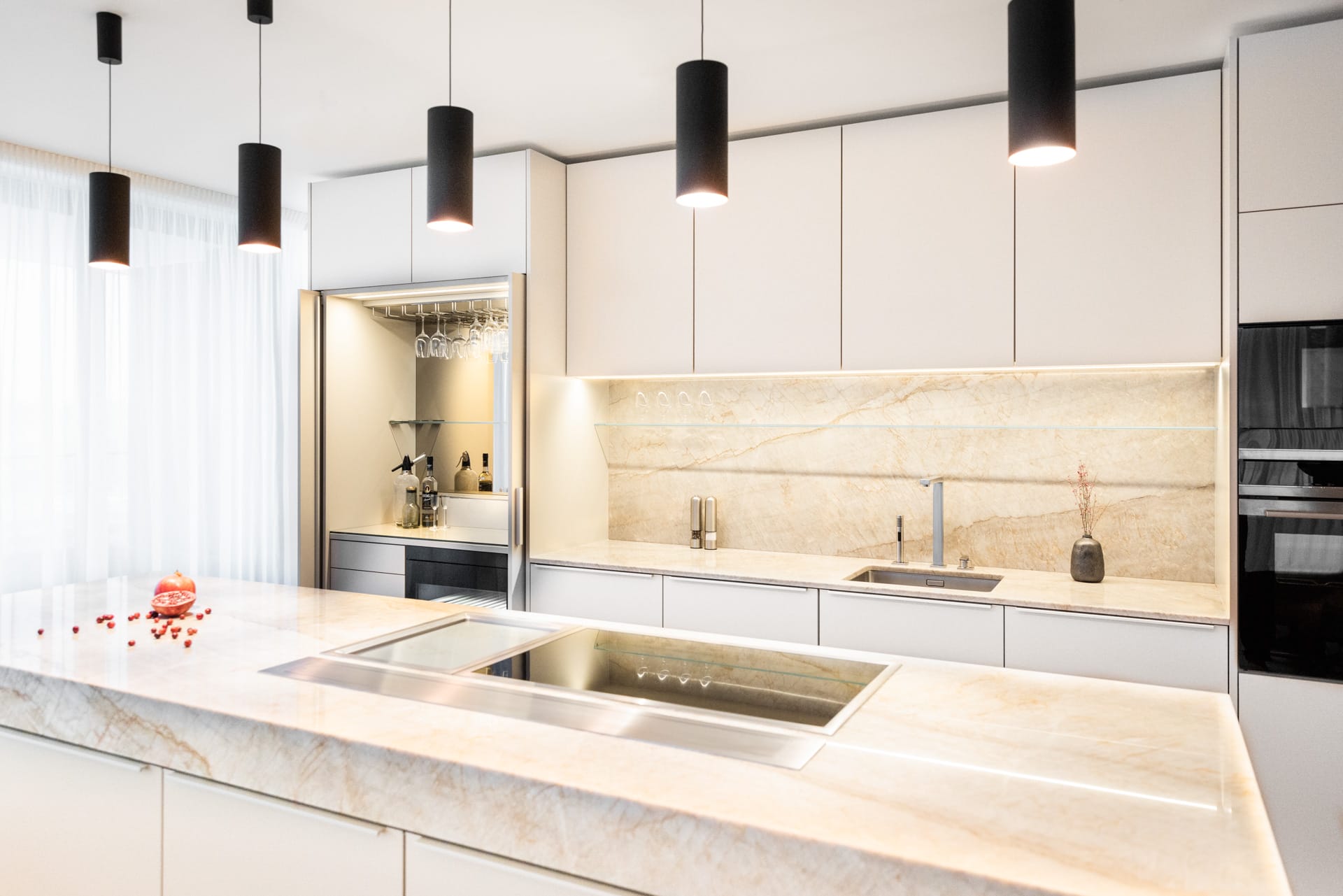 Dalším požadavkem bylo zakomponovat do kuchyňské sestavy bar, který byl vyřešen formou „pocket doors“ ,bar je schován za dveřmi, které se zasouvají do zabudovaných bočních kapes.