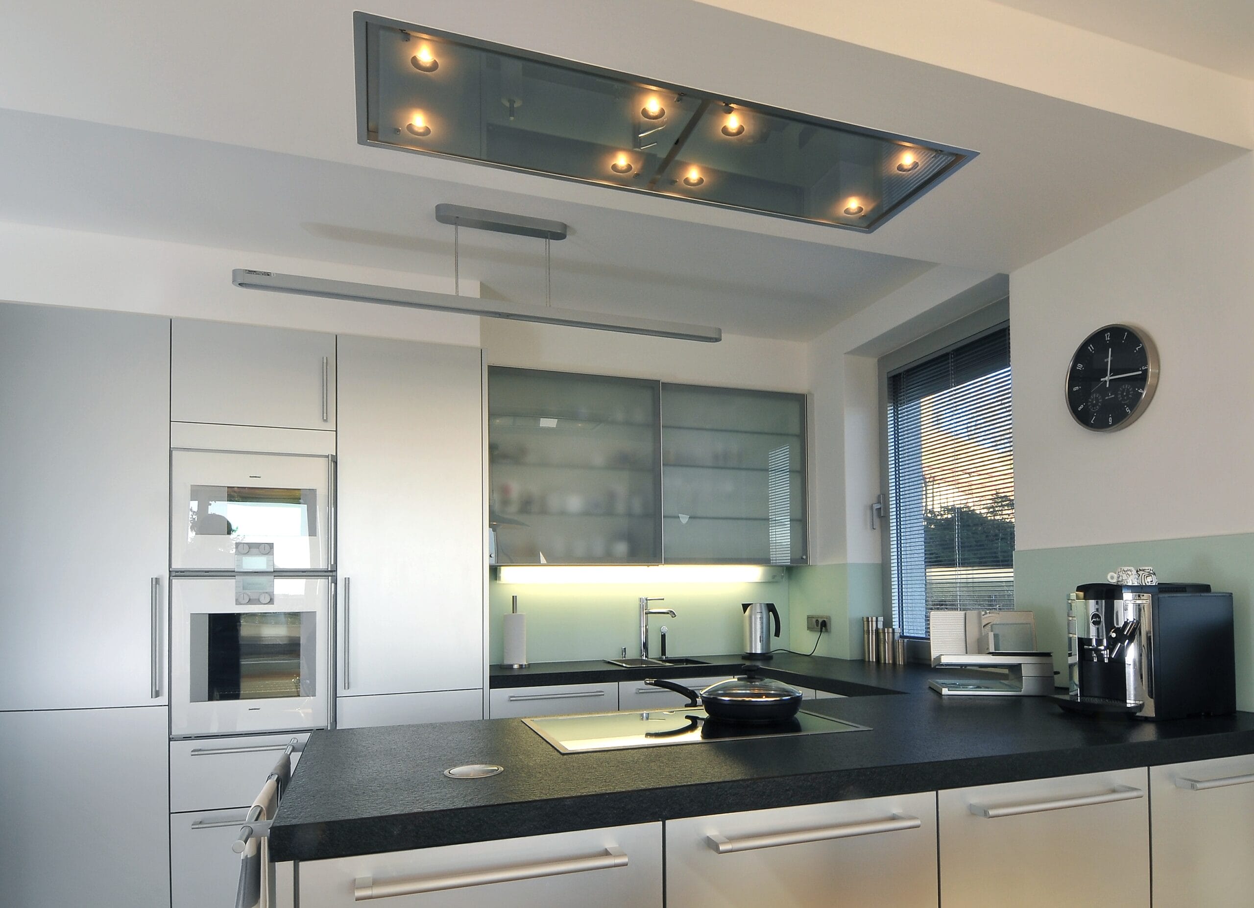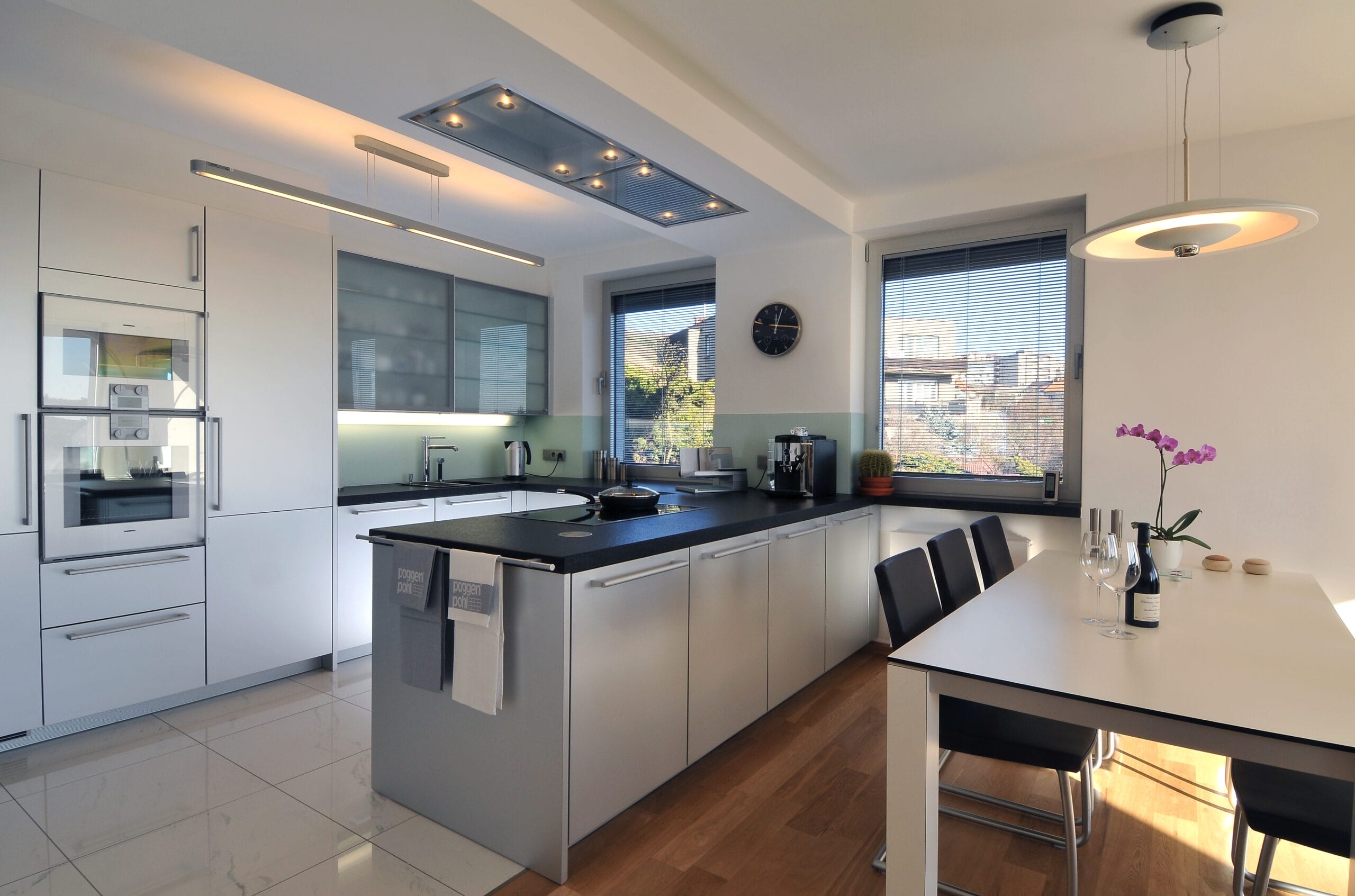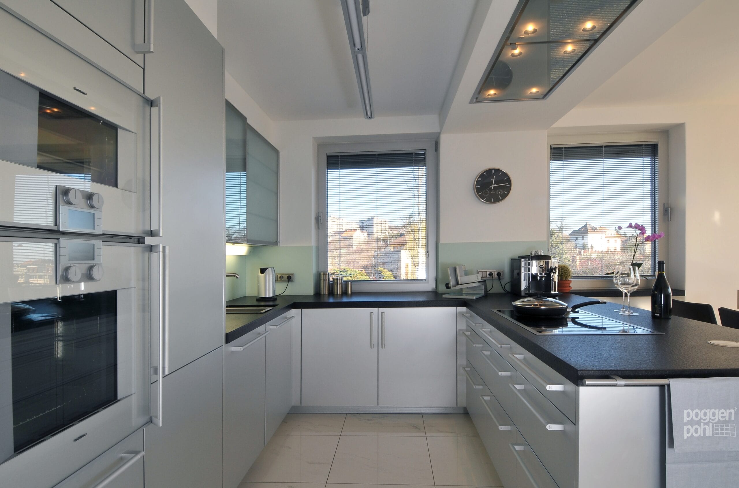 Provedení eloxovaný hliník. Pracovní deska žula Nero Assoluto patina. Spotřebiče Gaggennau.