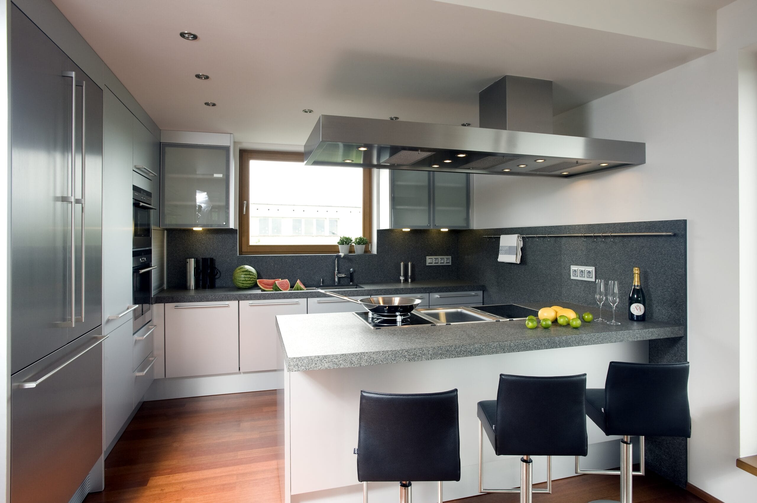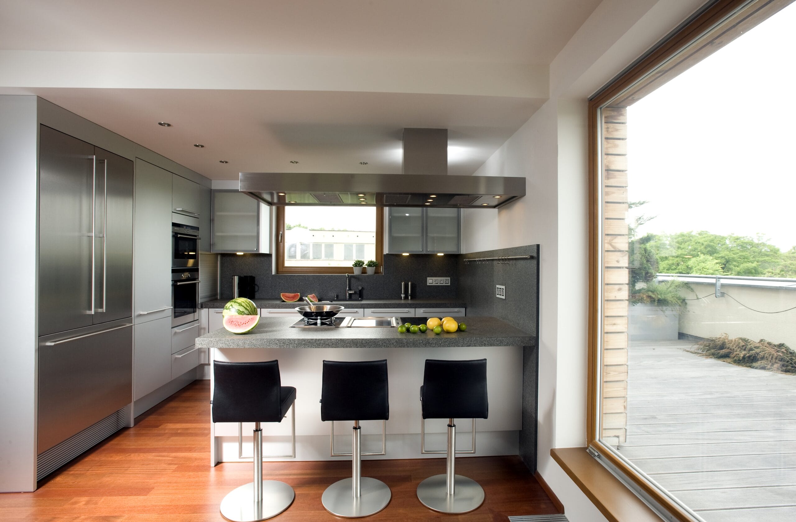 Provedení eloxovaný hliník. Pracovní deska žula Impala patina. Spotřebiče Gaggenau a odsavač par Gutmann.