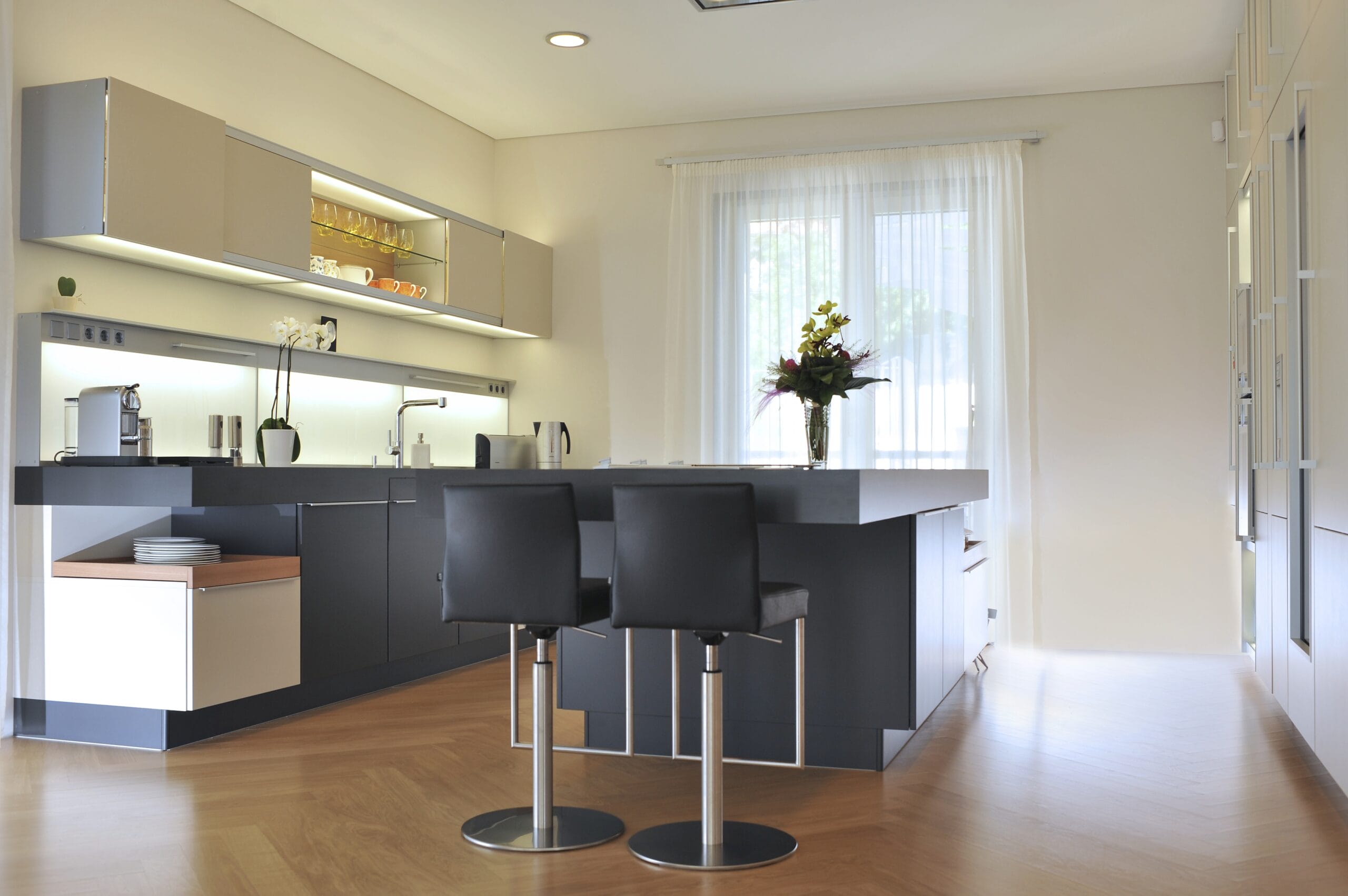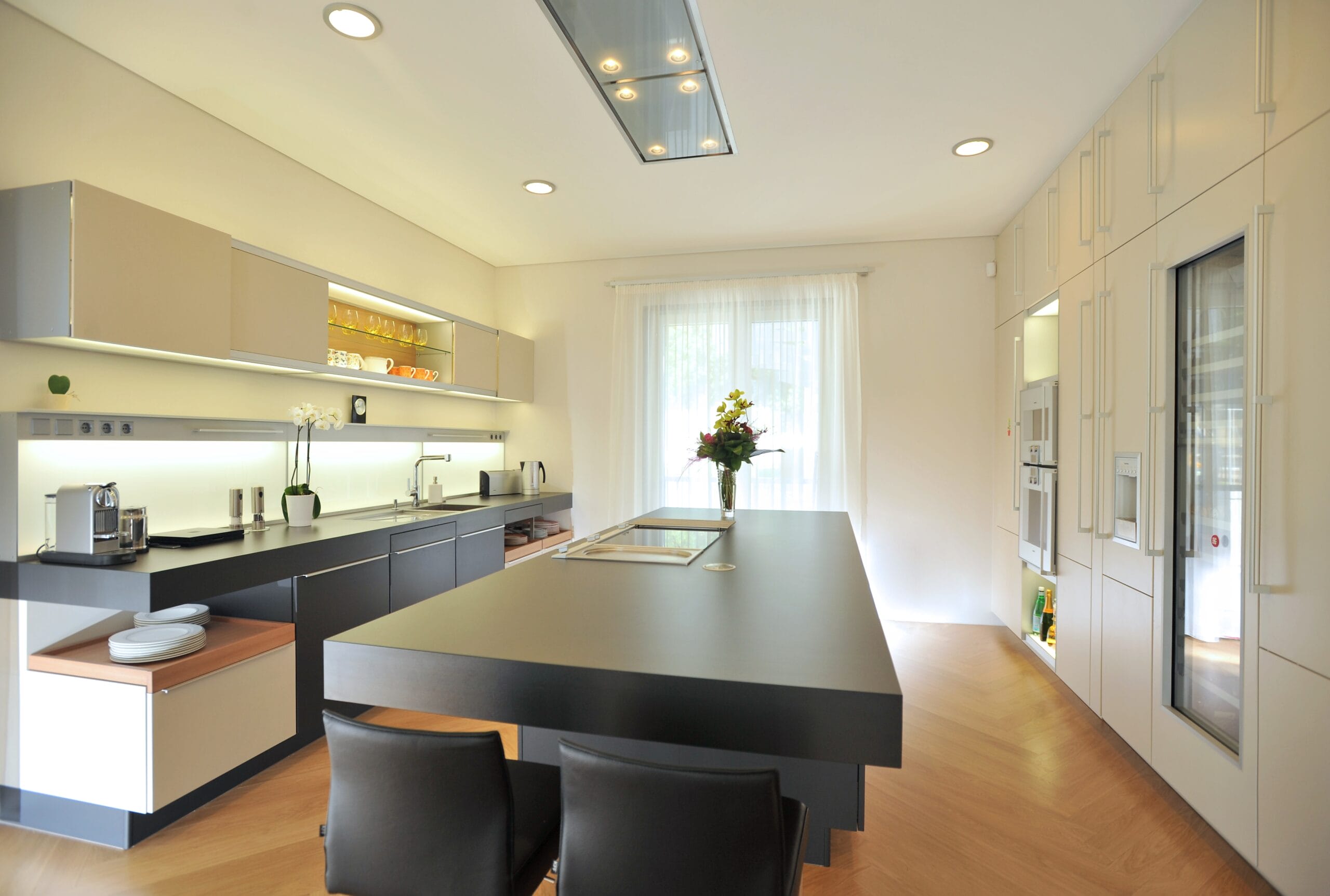Provedení kuchyně +MODO matný lak Mineral White a Titan Grey. Pracovní deska Melamin Titan Grey. Spotřebiče Gaggenau a odsavač par Gutmann.