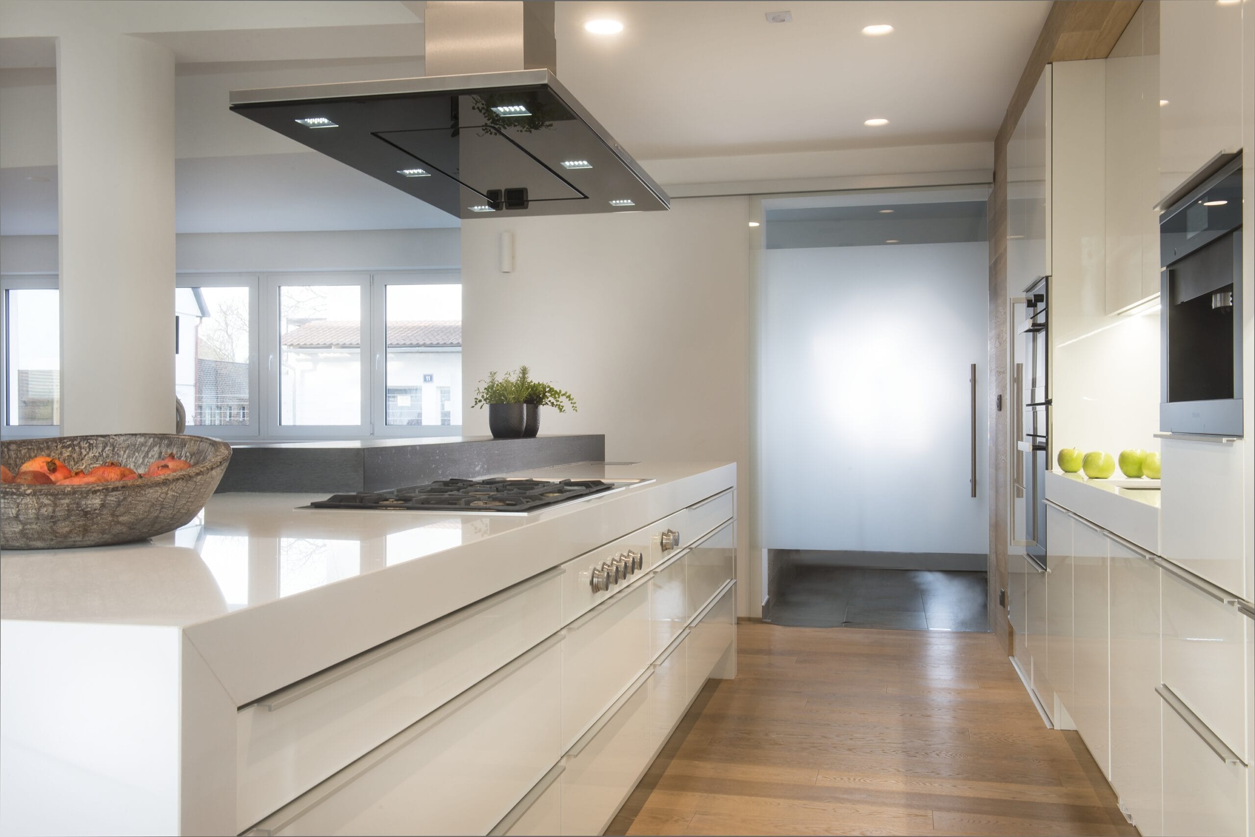 Provedení lak vysoký lesk Polar White. Pracovní deska Technistone Crystal Polar White. Spotřebiče Miele a Gaggenau. Odsavač par Gutmann.