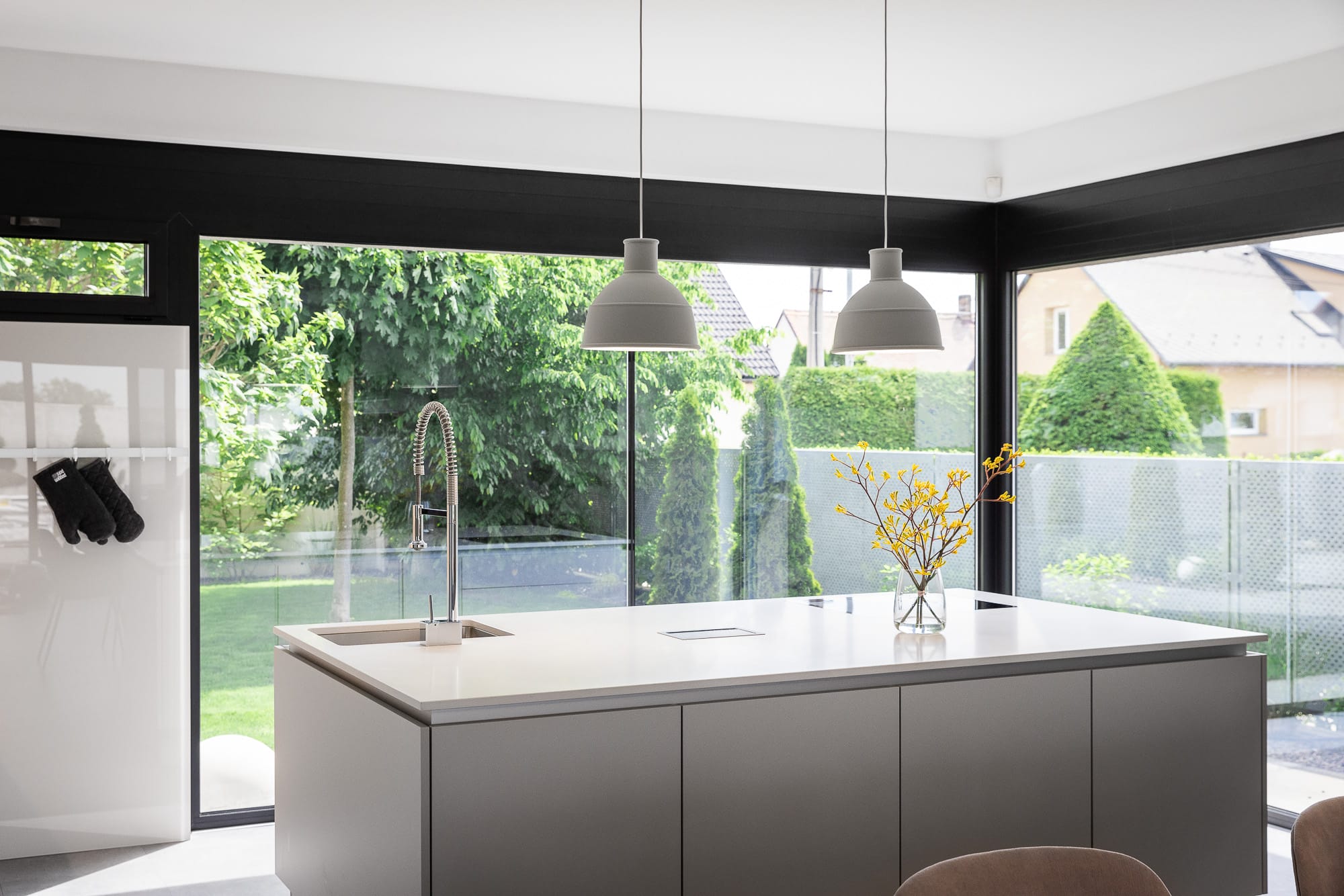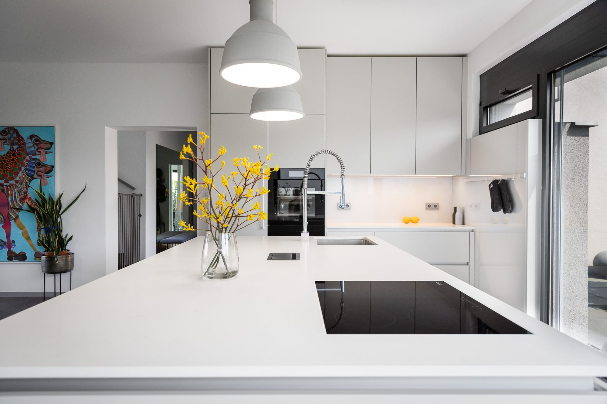 Provedení matný lak Pebble grey matt . Pracovní deska Lapitec Arabescato Perla.