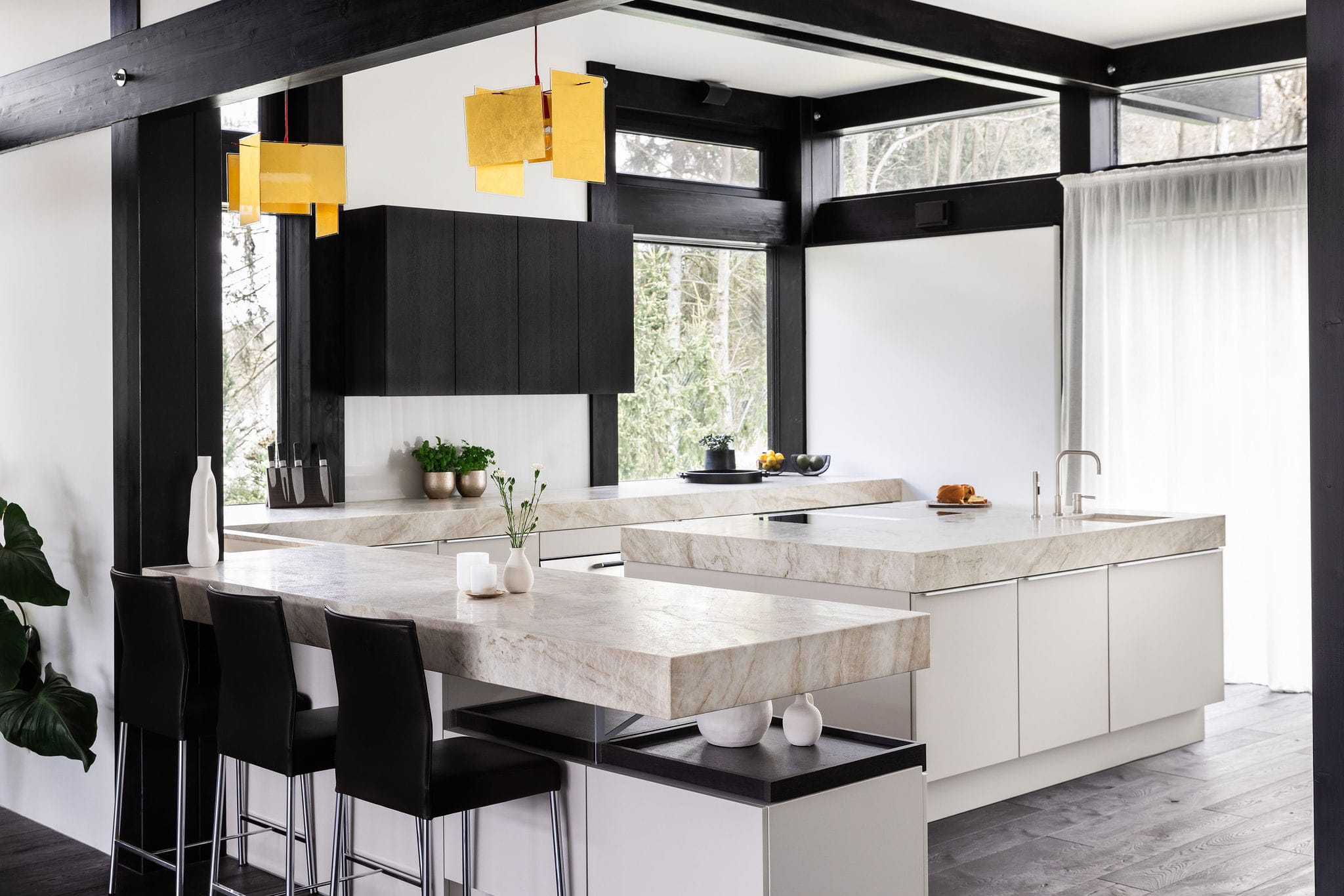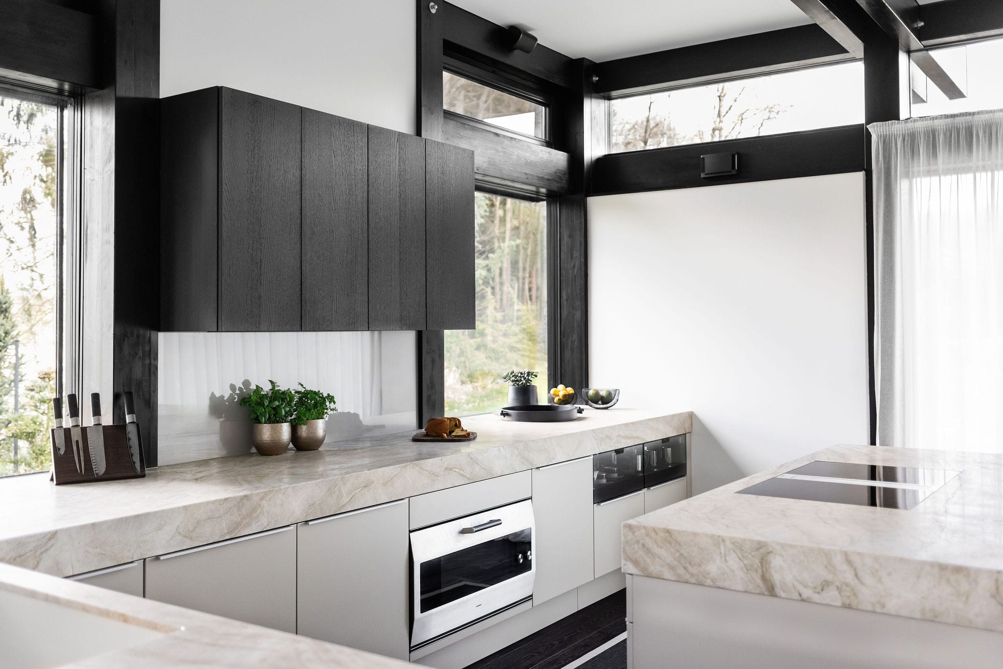 Provedení strukturovaný lak Pebble Grey. Horní skříňky a výsuvné police kartáčovaný dub. Pracovní deska Quarzite Taj Mahal. Spotřebiče Gaggenau. Doplňky System Ceram a Dornbracht.