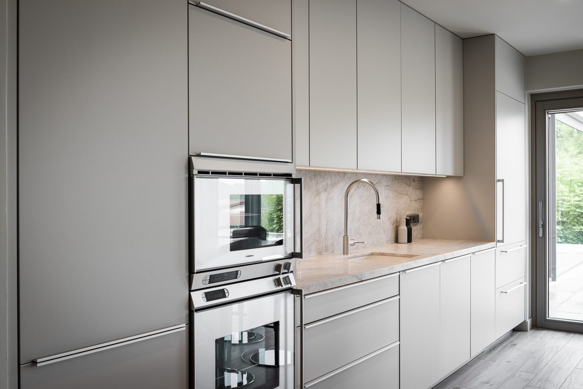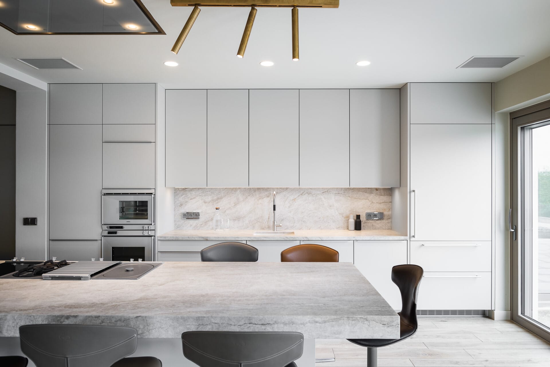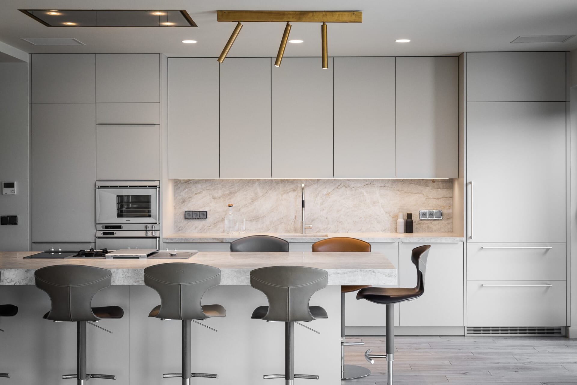 Provedení akrylový lak Pebble grey matt. Pracovní deska Quarzit Taj Mahal. Spotřebiče Gaggenau a doplňky Dornbracht.