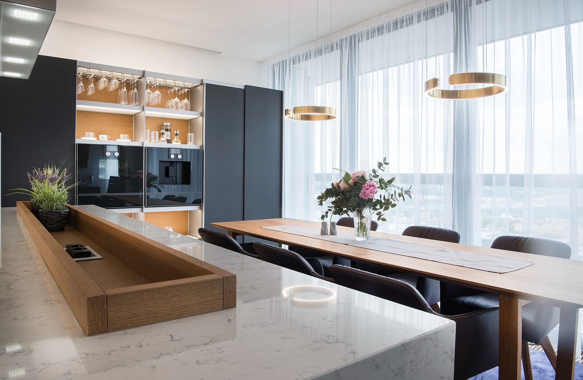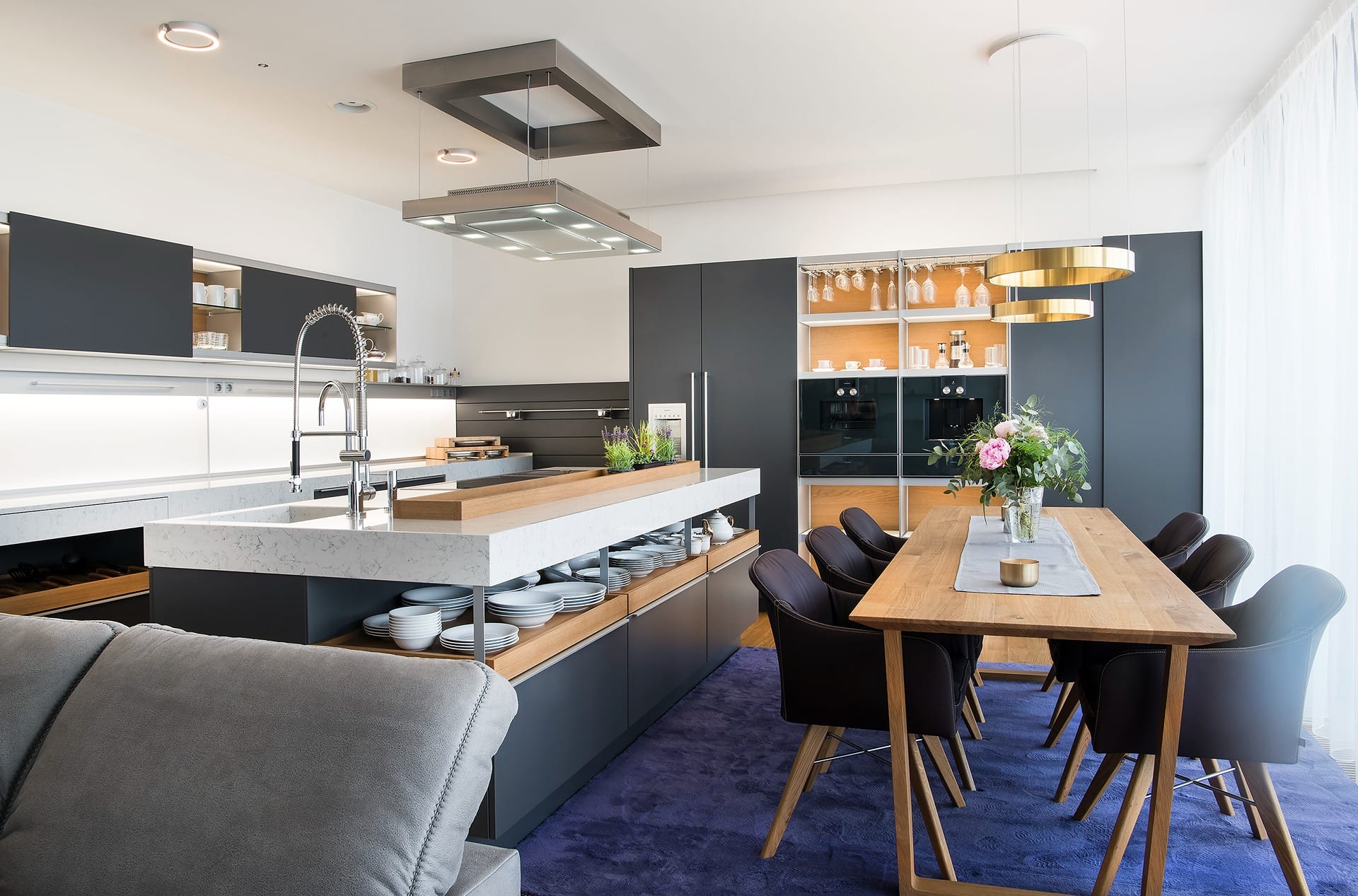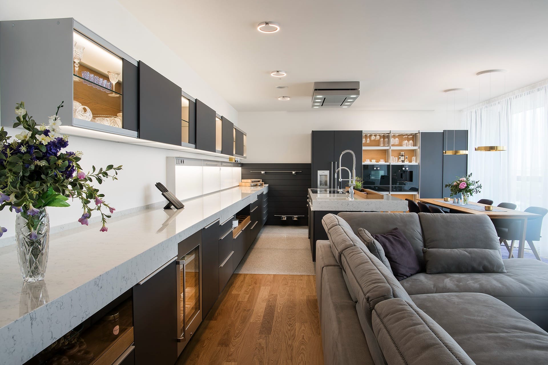 Provedení strukturovaný lak Diamond grey v kombinaci s dubovou dýhou. Pracovní deska Technistone Noble Carrara. Spotřebiče Gaggenau. Osvětlení Occhio. Sedací nábytek KFF Design.