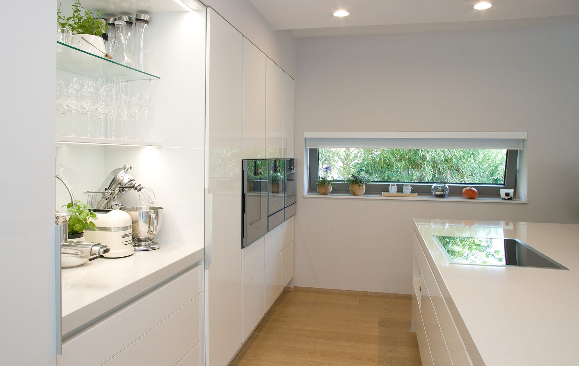 Provedení akrylový Polar white. Pracovní deska Technistone Nevada. Spotřebiče Gaggenau.